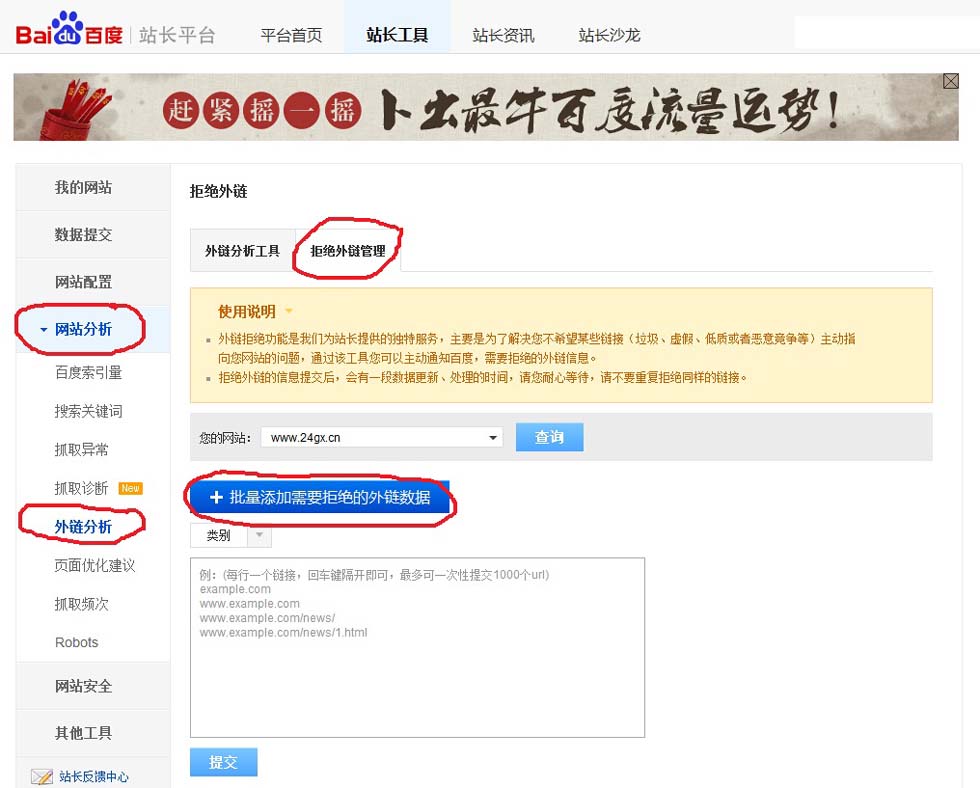 如果出现了这样的现象,你也不要太紧张,因为百度也想到了,你可以通过递交拒绝外链的数据来维护你的网站。具体办法是打开百度站长工具,注册登陆之后添加你的网站,然后点击网站分析——外链分析——拒绝外链管理——批量添加需要拒绝的外链数据,如图所示: