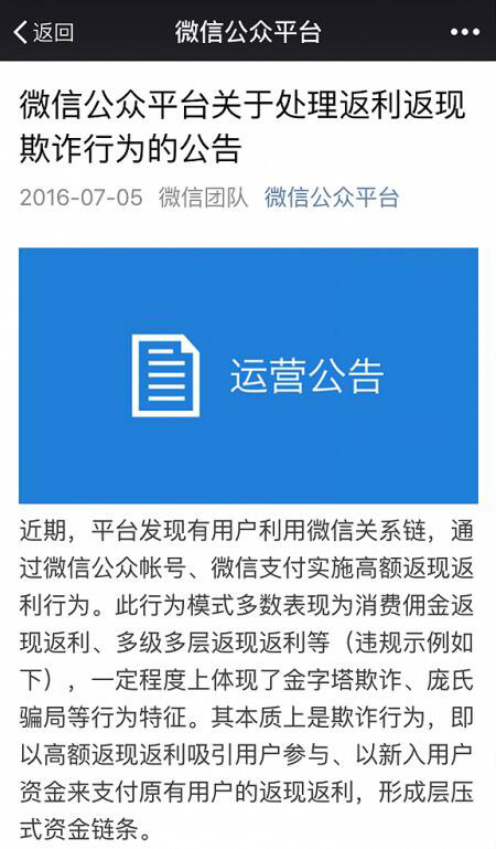 腾讯2016年7月公布了《微信公众平台关于处理返利返现欺诈行为的公告》,打击“消费佣金返现返利、多级多层返现返利”,下面的评论,几乎都是力挺腾讯,呼吁严厉打击。