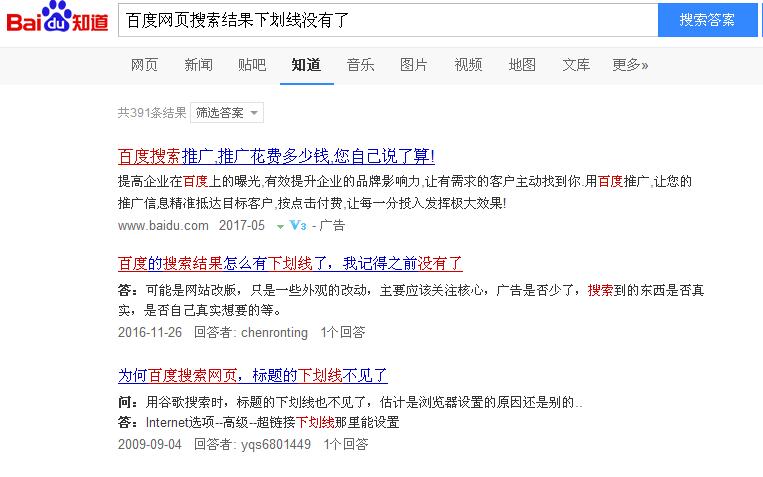你注意到了没有?今天看百度搜索结果有点怪怪的,仔细一下,原来是百度网页搜索结果去掉标题下划线,看了还真有点不习惯。不过除了网页搜索结果外,其他栏目的搜索结果标题下划线还在。