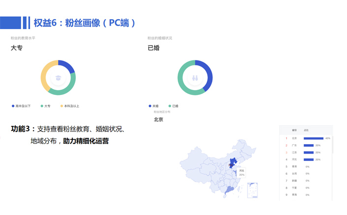 功能:粉丝画像工具能够为您统计粉丝的性别、年龄、教育水平、职业分布、人生阶段、所在地域和终端分布情况等粉丝属性