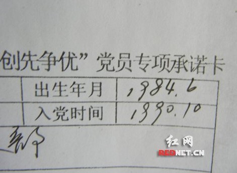 近日发现中国入党年龄最小的党员,桃源计生局龙某在党员专项承诺卡里显示入党时年龄只有6岁。这一喜剧源于桃源县计生局机关党支部负责人把关不严,造成了工作上的疏忽,向广大网友致歉。计生局党组当天下午召开了全体干部职工会,对对象本人及党支部负责人提出了严肃批评,并责令其做出了深刻检查。
