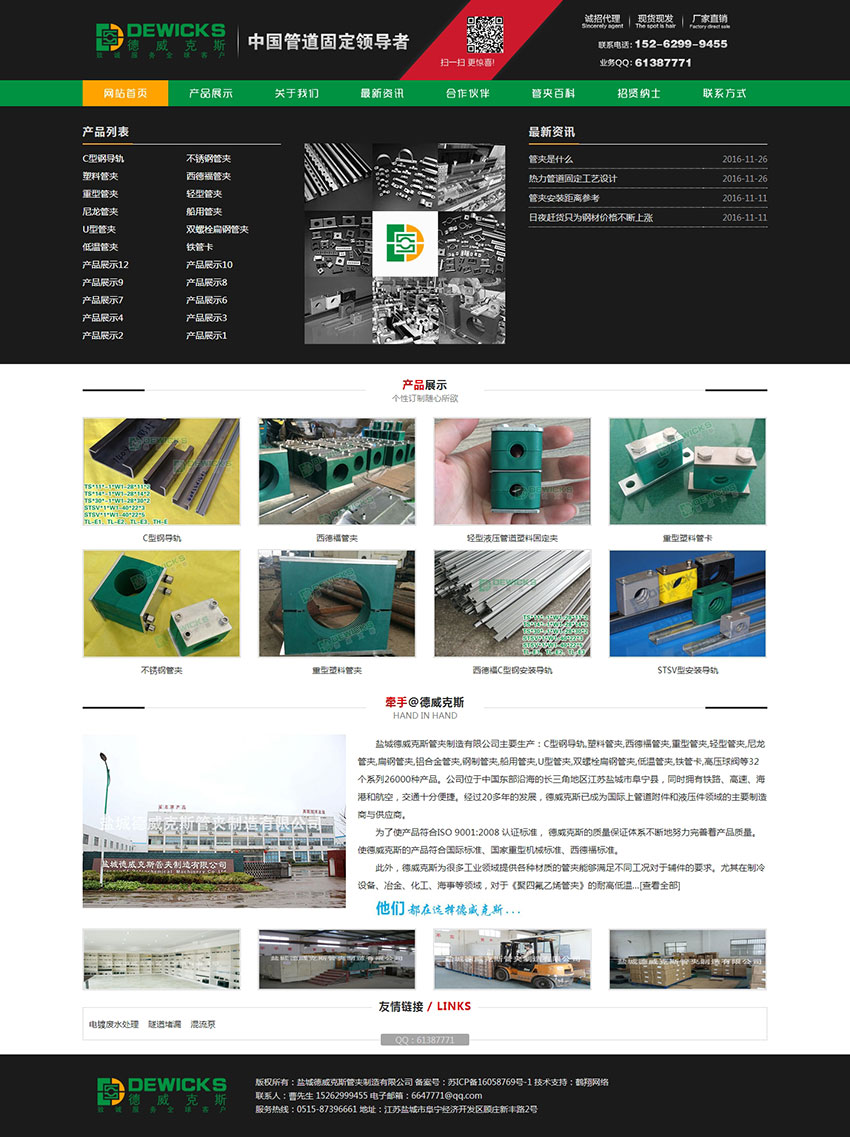 盐城德威克斯管夹制造有限公司主要生产C型钢导轨,塑料管夹,西德福管夹,重型管夹,轻型管夹,尼龙管夹,扁钢管夹,铝合金管夹,钢制管夹,船用管夹,U型管夹,双螺栓扁钢管夹,低温管夹,铁管卡,高压球阀等32个系列26000种产品。以使德威克斯的产品符合国际标准、国家重型机械标准、西德福标准。为了使产品符合ISO 9001:2008 认证标准, 德威克斯的质量保证体系不断地努力完善着产品质量。